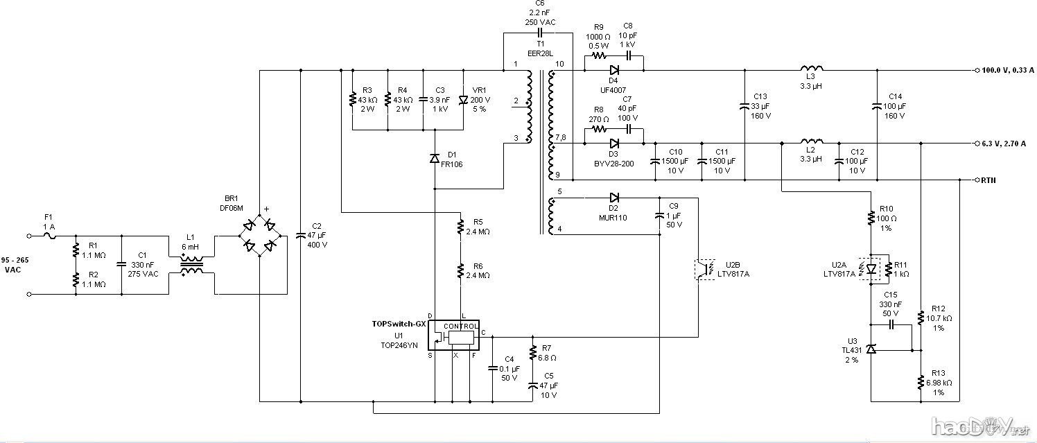 只有开关电源了,可搜遍网络,都没有275V输出的小开关电源,怎么办?只好再花几个月学习了开关电源的设计制作(本人只是名会计哦)