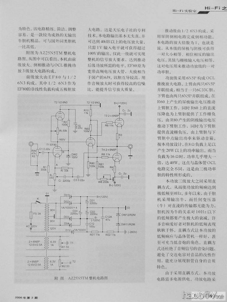 经过改造已经完成,声音还是不错的没有让我失望虽说是6N5的印象不咋地但是从这个机器上面反映了该管还是可以改造的有发掘的潜力只要是应用好了一样出好声音的,和我的大甲比较了一下还是稍微逊色了一点做2台8管6n3+6N5P的OCL无输出牛推挽胆机玩玩 不过已经很满意了