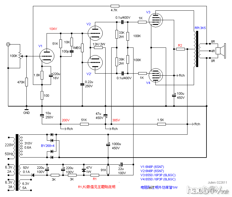经过一个月的筹备制作6550推挽机终于完工了。图纸是J版的简洁版6550(6L6)推挽机