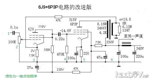用了输出4欧和8欧转换开关而减少后面二个输出接续柱 接地左右声道分开,按上图绿色的数字走,一点接地不错,开机不插音源耳朵贴近喇叭都听不到电流声