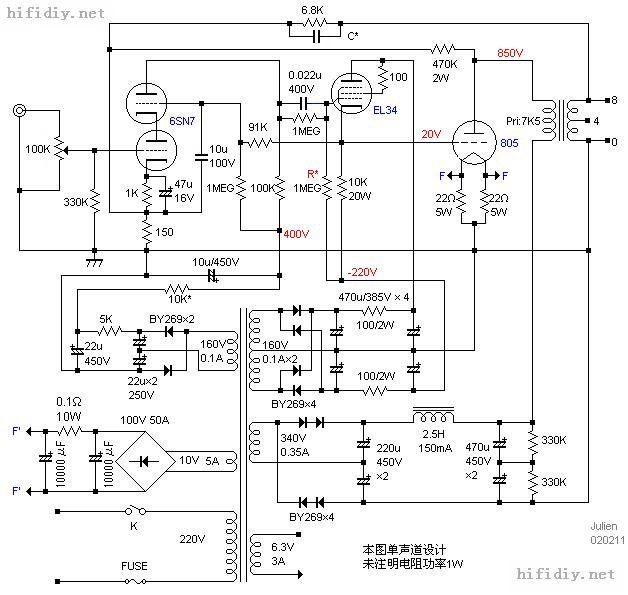 自从J版的新805出来后,手就一直痒痒总想再装一台,这阵总算有空把它做完了,感谢J版的设计这么好的图纸为大家带来很多的快乐新版6sn7+el34+805单端胆机完工 高压电源部分用的老版的混合整流方式,其他按图没变。声音感觉比老版平衡,频响宽,驱动力更强!!