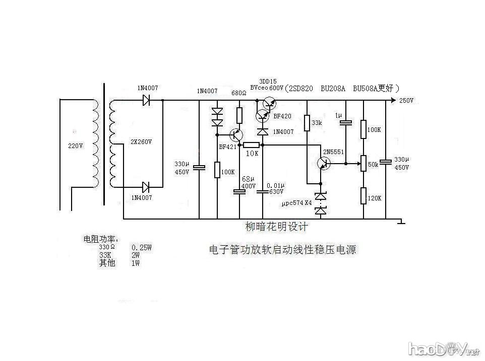 准备搞点小实验,要用到电子管,先制作电源.本电源按全晶体管线性稳压设计,特别设计了性能优良的软启动电路,通电后输出端电压从0V缓慢上升,按图中数据9秒后进入工作状态,此举能有效解决电子管开机高压冲击问题.安装非常成功,做完小实验后,本电路将用于DIY到红