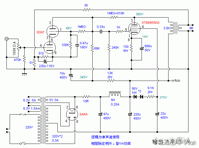 搞了两天,只完成了以上这些,先画个搭棚示意图,大家看这样搭棚可以不?给点意见: ![]() 面那个电路图怎么不显示呢?再上: 电源变压器铁芯是108*90的,舌宽36mm,叠厚60mm,计算铁芯面积S=3.6X6=21.6平方厘米。按照公式 S=1.25 / (开方功率)(cm2)计算,变压器功率为298W。取每2匝1伏算,初级220V用Φ0.47绕440匝,次级高压320V用Φ0.25线绕640匝,电源管灯丝5V用Φ0.8线绕10匝,6.3V用Φ0.8线绕13匝。 计算依据按下面取(根号论坛打不出来,只能抓图): ![]()