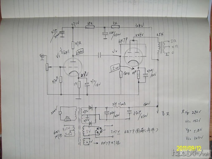 前段时间在网上邮购了一套6P3P的套件(刚接触胆机),装好后发现诸多不足,所有的牛都小,成为鸡肋,留之无用,弃之可惜...... 为了利用这个机壳和几个小牛,留意坛中和其它信息,觉得有种管子可以发挥它们的效能,它就是我这两天装的6N7P。 其理由如下: 1.6N7P和6P3P一样都是功率放大管,但工作电流比6P3P小,能发挥套件中小牛的作用 2.6N7P作并管输出,输出阻抗减小一倍,在3.5K的套件输出牛这种条件下,可以工作,比6P1、6P6等小功放胆的输出功率大 3.为了更进一步减轻火牛负担,用晶体管整流,节省灯丝功率,又提高了输出电压。 4.变鸡肋为大餐...... 刚好前天邮购的6N7P到了,抓紧时间装机 昨晚装好试机,太妙了,底燥非常干净,带我的8寸S8声音很好。旋钮只要10点不到 其它就不多说了,上图 ![]() ![]() ![]() ![]() ![]() ![]() ![]() 功率到底有多大我目前没有测试,比套件装的6P3P的声音大,也好听多了。 ![]() 6N7P的阴级电压5.2V,阴极电阻240Ohm,换算成屏流为21.66ma (责任编辑:admin) |