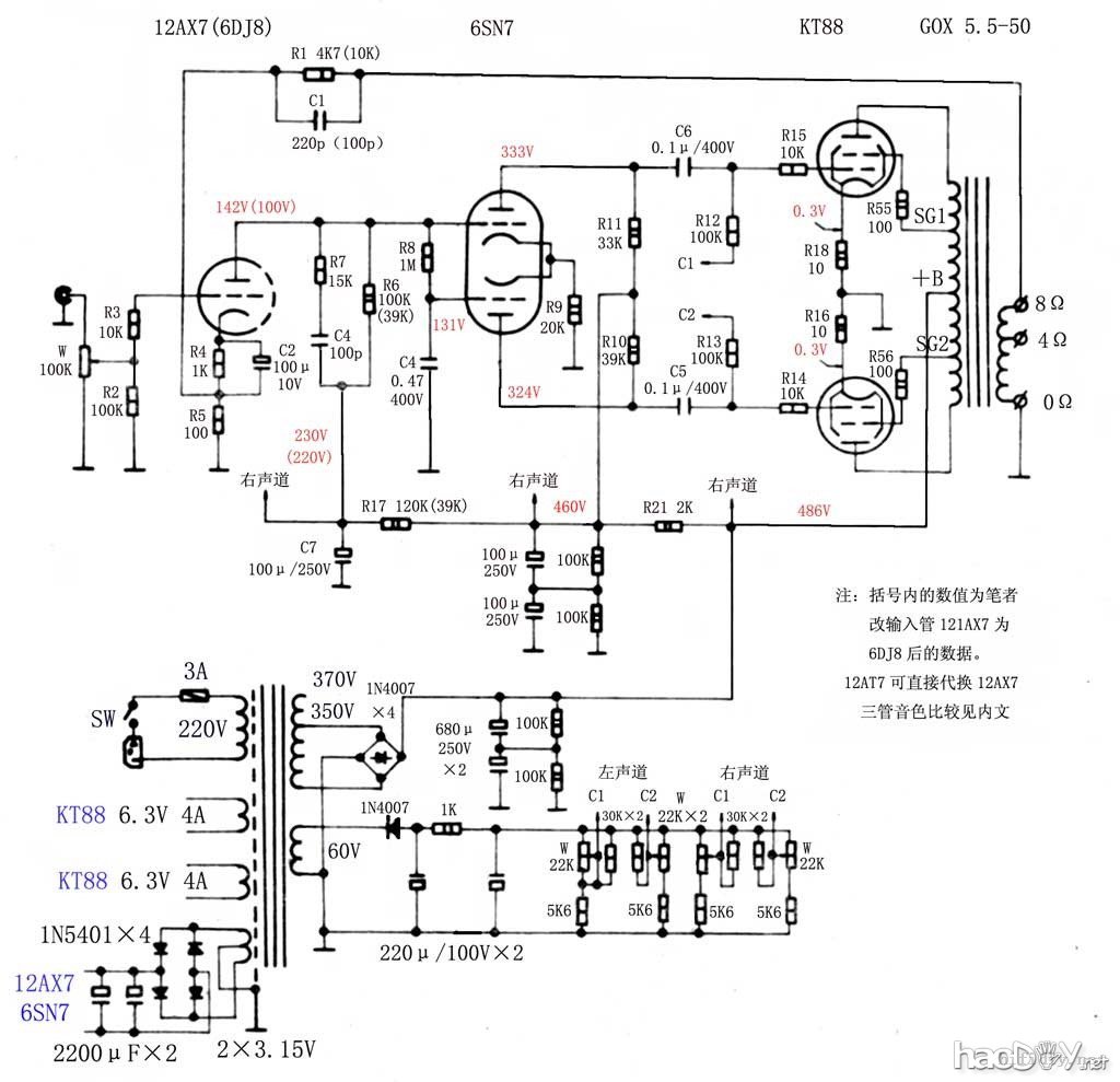 2.将倒向管升级成12AU7,然后改动部分电阻