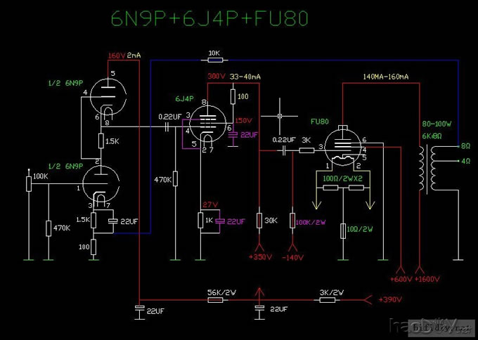 首先祝大家新年快乐!万事如意! 献上年初制作的FU80单端 FU80-胆机中的战斗机 经过几个月的努力,先后试验了N种电路,我的FU80终于完成了,由于FU80工作电压高,灯丝电流大11A,发热量大,所以这次比较谨慎,全部过程是用示波器和假负载进行调试的。为便于调试,我是做了一段1000HZ的音频用电脑播放进行调试。 电路输入级开始用的是6N8P SRPP+6P3P推动,经试验推动不足,实测FU80功率输出只有8~10瓦,如果用CD机播放功率可能大些。后改用6N9P+6P3P推动,功率略有提高,还是不满意,之后又在另一个声道改用6J4P+6P3P推动,这次增益足够,接上喇叭试听,音量电位器只能转动1毫米,要么是无声,要么是震耳欲聋,调整了6J4P的廉栅极电压到100伏,接上10K负反馈后,增益降低,用电脑播放一段发烧碟,效果不错,原来6J4P的声音也是这么甜美,点上一只烟,靠在椅子上,凝视着音箱开始慢慢的品位,这时看到音箱前面的一块瓷砖在震动,心想可能是瓷砖松了吧,没有在意,过了一会儿音箱也开始震动,又一想可能是音箱没放平吧,只顾欣赏音乐,仍是没有在意,片刻之后,桌子开始震动,桌上立着的机箱也开始大幅度震动,观看示波器调到最大分辨率波形也未见异常,声音也正常,心想这可能就是寄生震荡吧,如果不是次声波就是超声波,因为是低频,次声波的可能性大些,马上关机,待管子冷却后再次开机,现象依旧,负反馈加大到20K后现象消除,考虑到负反馈太大会影响音质,负反馈还是恢复到10K,重新调整了6J4P的廉栅极电压,发现廉栅极电压调到60伏时比较稳定,调到100伏时就容易产生寄生震荡。由于买到了第2天的车票,匆忙改完另一声道后回家过春节。 春节过后,仔细分析觉得如果不用变压器偶合,推动级无须用6P3P,于是又改为6N8P SRPP+6N8P/2+6N8P/2两级放大推动,增益足够,功率可以做到90W,效果也是很好,后又改为6N8P/2阴极输出,听感也是不错。只是觉得级数太多了,担心大环路负反馈会引起相位偏移。后又减少一级放大改为6N9P SRPP+6N8P推动,功率略小可以做到50W,最后确定为6N9P SRPP+6J4P+FU80。 在整个试验过程中,6J8P也用过,从曲线来看6J8P的线性比6J4P要好,在输入信号幅度不是太大时试验了6J8P的零栅压状态,此时输出可以达到不失真功率26W,如果加大信号幅度,通过示波器可以看到,波峰被拉尖了(由于栅流),而波谷被拉宽了(超出6J8P的线性范围)。因为我手中的6J8P都是M级的,所以没用。 至于6N8P和6N9P,6N9P的高音明显要比6N8P清澈透明,而6N8P在听感上要比6N9P温暖厚实,烧友可以根据自己的喜好选择。如果要做FU80胆机,个人觉得以下几种电路较好: 输入6N8P SRPP+6J4P推动或6N9P SRPP+6J8P推动; FU80的调试很简单,接上10欧50W假负载,廉栅极电压调至500-600V,用两块万用表一个接在阴极电阻上观察电流,另一个接在假负载测试输出电压,同时用示波器观看输出波形。调整FU80栅极电压在-60至-90V时,FU80相应的阳流在150~250MA,阳流在150MA时不失真功率大概在40W,阳流在250MA时不失真功率大概在90W,烧友可以依据自己的听音环境和电源牛功率选择。 其实FU80胆机最大的难度是电源部分,高压带来绝缘问题,电源变压器绝缘和输出变压器绝缘;大电流带来的温度问题,大功率带来体积和重量问题,当然还有美观和造价问题。 我这台FU80胆机,FU80的工作电压取到1600伏,高压空载1800多伏,采用两个高压牛和一个灯丝牛,由于100W输出牛太大,改用两只60W输出牛串联。一共用了10个牛。电源牛总功率1320W,每个电源牛罩中装三个电源牛,并采用12V电扇强制风冷。 高压牛罩是采用长筒灯和象鼻灯改制的,去掉象鼻灯上的射灯,装上一个小电扇可以给牛散热,后来将电扇装入了牛罩,就在上面装了一个LED作为高压指示灯。 FU80的灯丝开始采用的是直流供电,四个10000微法的电容滤波,50A的整流桥,开机后整流桥太热,加装了两块散热片还是太热,另外交流声很大,加平衡电阻后还是交流声大,测量后发现整流桥的两臂电压本身就不平衡,相差很大,一边是7.2V,另一边是4.4V,耐压越高,相差也越大。于是尝试交流供电,只要跨接灯丝两边的平衡电阻阻值相同,交流声还是很小的,大概在3~5mV之间。 要减少交流声,首先要做好接地,做到一点接地,之后用示波器延电路逐级查找,找到后对症下药进行处理,修改布线或更换电容。最后再用示波器检查,信号关到最小后,显示是一条直线。开机试听,除了开机时音箱“嗡”的一声后,再没有交流声,耳朵在音箱布上,才可以听到“沙沙”的电子噪音和轻微的“嗡”声。 在装机过程中被高压电击了5次,其中一次是FU80管帽的1600V的高压,手指打了一个白点,半个胳膊都是麻的,半个月后,手指上的斑点象个肉刺似的脱落,其余几次电击都是调试中被电容打的,切记在调试中电容一定要及时放电。 全部完工后,接上音箱进行试听,低音富有弹性,厚实而有力,人声甜美,高音纤细,细节丰富,交响乐气势宏大,声场定位准确,爆棚易如反掌。 相机的SD卡坏了,内部的图片也没了,其余的图以后再补吧。 (在2008年最后时刻决定参赛) 胆大妄为2008.12.31 正面照