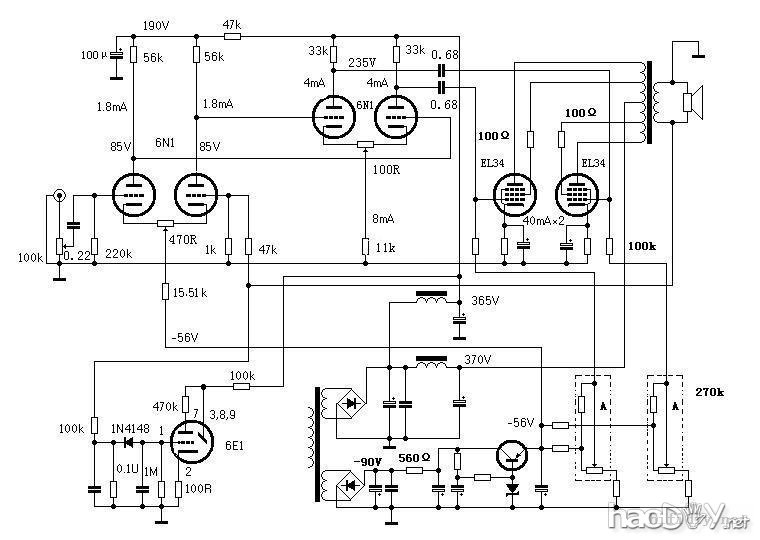 亦可选第二差分级的工作点为4ma/265V/150V/-3V。计算得Ra=33k,若不用电子管恒流,可得阴极电阻为11k。