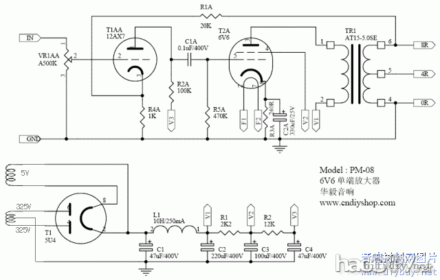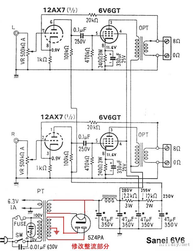 昨天终于抽空把 12AX7 推 6P6P 单端做好了. ![]() 声音还不错(偶的木耳听来如此 ![]() 基本按图纸制作,重点在电源部分作了些修改. 12AX7-6V6GT实作电路