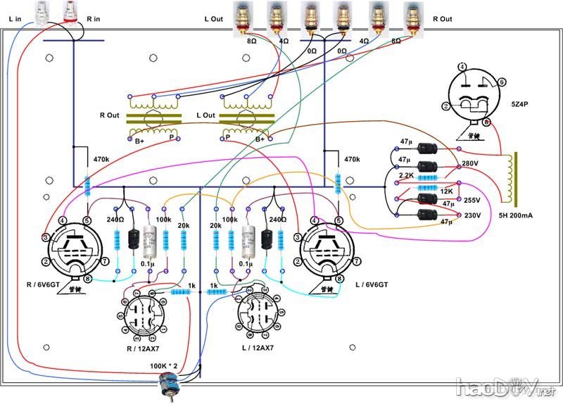 最近在备料想再做部6V6的单端。 机箱是在坛里淘的半成品,管子孔已开两大两小,不想再改了。故6V6的推动管只能在九脚管里选。 请高手指点用什么管推 6V6 ? 有什么电路可借鉴。 另因我的输出牛没有超线性接法的抽头,所以考虑6V6还是采用标准接法。 谢谢! ![]() ![]() 在等电牛。 今天把原来买来时机箱带的管子衬板重新做了一下。原来的衬板上的开孔和机箱上的管子开孔有较大偏差。 上两张摆位的图片。 ![]() ![]() ![]() 初步定下来选用12AX7推6V6GT的线路 根据线路图画了个搭棚布线图,灯丝部分没画,电源部分从整流输出开始画,整流之前没画好。 再贴一个机箱内部模拟搭棚的图 ![]() 请高手指点 搭棚布线图