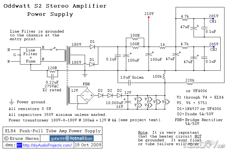 照片1:Poddwatt类立体声EL84(6BQ5)真空管放大器警告:本项目采用高电压。接触这种电压可能导致人身伤害或死亡。如果你不熟悉的高电压和高电压设备安全地建立,那么请不要尝试这个项目。我希望大家都来享受音乐,而不是在这个过程中有任何人受到伤害。 电源供应器该放大器使用一个单一的电源,用4个滤波器节。前三部分是常见的两个通道。最终的过滤器部分被分为两半的SRPP,使每个有它自己的滤波器。我这样做,这样有两个通道之间的相互作用很小。四节开始快速恢复的固态整流器和一个电容输入。的四个部分中,是三个旁路用聚丙烯帽。这项安排的最终结果是一个放大器,是非常安静的。我最讨厌的嗡嗡声和噪音,并采取特殊的护理,以尽量减少他们。我想听到的音乐,而不是嗡嗡声。 图1:EL84(6BQ5)Poddwatt电源原理图(2009年10月)5751 SRPP驱动程序第二阶段驱动阶段是一个相当简单的的SRPP设计两个部分,一个新的生产Sovtek 5751真空管。对于那些不熟悉这个管,它是一个12AX7相似。5751与12AX7是引脚兼容的,但不能直接互换的一些参数是不同的(5751增益低30%左右,比12AX7)。我尝试过其他品牌的5751真空管和Sovtek品牌的比别人低失真。5751 JAN Philips的电子管使用在较大的安培没有执行,以及在这些放大器。偏置点为SRPP约1.25毫安。这是足够的,以确保线性响应。SRPP作为功率管驱动器的驱动程序都特别好。在这里我选择了一个简单,增益,线性度,驱动能力,电源噪声抑制。5751 SRPP驱动级的增益的是约32倍或30分贝。 图2:5751 SRPP / EL84(6BQ5)电子管放大器电路图(2009年10月)EL84(6BQ5)的SIPP输出阶段输出级是一个自我相推挽设计的紧凑型后的Hi-Fi功放的梅尔文·莱博维茨(SIPP) 。基本的设计已经存在了很长一段时间(50年左右)。与早期的应用程序的问题是,这是困难的,迫使它以线性方式进行操作。它只能作用在一个类-A模式与两个管子一直在进行。这个电路是有吸引力的原因是,它消除了需要一个分相器阶段。它仅需要一个单端驱动器。固体电子学的出现,提供了一个解决问题的办法。一个简单的应用程序的一个共同的LM317 IC电压调节器将其转换为一个非常精确的恒定电流源(CCS)。使用CCS在阴极电路的SIPP阶段部队工作在A类。从而成为一个平庸的输出级是一个什么样的高度准确和相当出色的。乍一看,它会出现输出级将无法正常工作,如果在所有。但是,如果你研究的电路,你可以按照信号的路径。第一条线索是,虽然对管的电流是恒定的。 (责任编辑:admin) |