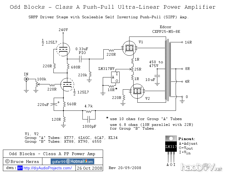 图1:OddBlocks - 12SL7 SRPP / KT88推挽电子管功放原理图图2:OddBlocks - 电源原理图DIY的部分是,你可以做的事情,制造商不会。我发现6NO30“管”的来源。对于那些你不认识它的人,这是一个八进制插座一个热继电器。这是一个很老的技术的小发明。它是作为12SL7相同的大小和形状,并因此增加了一个不错的对称性的安培。这些“管”的工作的原则上的加热元件和双金属开关。在充满电触点的额定电流为500,000次。不幸的是,接触的额定电压为120 VAC(额定击穿电压为500伏时,新的 - 这意味着什么)。显然,这是不足够高,为360伏交流电被切换。所以,我用的是接触激活一个12伏的继电器,连接交流电源(360 V)整流器实际的工作。该6NO30激活延迟30秒。以及其他值的热继电器。这些便宜(2.96美元)NOS。为他们的编号如下:第一个数字(s)是加热器电压。。接着NO常开或常闭,常开或常闭的内部触点。最后的最后的数字表示秒的延迟。使用热继电器可能是疯癫的一种表现,工作可以做简单的用一个晶体管和几个无源器件,但可以肯定的是凉爽。其余的PS我的其他项目。我用的,因为它是一个通用的,便宜的12伏特3安培SMPS电源加热器便宜,非常紧凑,提供干净的稳压电源。一种常规的变压器,整流器,和过滤器可以被使用。电源变压器的绕组上的Edcor是6伏,和“A”组管将是令人满意的。对于“B”组管更大的变压器是必要的。一般情况下,这是一个有点更容易(更便宜),以获得所需的功率在12伏,2安培,比6伏和4安培。的损失是一个较低的。交流,可以使用上的加热器,以及。它最有可能增加本底噪声位。如果你是像我这样的,你讨厌的嗡嗡声和噪音。我会坚持的加热器,但在所有版本的“预算”这些放大器的开关电源。 的建设 - OddBlocks电子管放大器构建是非常简单的。的底盘钢哈蒙德购买仿古电子供应。变压器来自Edcor。接线是点对点,我使用了一些终端(又名炮塔板)板的连接。更敏感的电路被置于作为尽可能由电源变压器和噪声源。滤波电容器和B +继电器被粘在机箱上。一个显着的特点是使用的接地总线看作是一个大型的裸铜线的照片。曾在过去的项目中,最大限度地减少嗡嗡声,噪声和接地回路的可能性。关于加热器电路需要一个特殊的预防措施。我发现前一段时间很容易超过你使用SRPP设计的驱动管的阴极额定电压时的加热器。有几种可能的解决方案。我使用的是偏置在大约三分之一的240伏的电源的加热器。有没有电流流过(只是一点点的泄漏 - 在微安范围内)。用这种方法有两个非常重要的考虑因素。一,可以接地的加热器电路的任何部分。其次,加热器功率源还必须不得接地参考。它需要浮动有点像多管整流器的加热器电路。如果您使用开关电源SMPS,它需要有分离的输出从输入和不以任何方式引用到地面。如果它不是,则故障实际上是保证。在施工中的另一个重要的一点是在CCS的连接。“调节”的LM317HV端子被接地。感测电阻器的输出端子和接地之间。这是不同于作为一个电压调节器的使用的IC。当正确连接时,电流为等于1.25除以欧姆的电阻器的值。因此,10欧姆将导致在0.125安培电流流动。CCS需要热sinked,因为它要处理多达8瓦的功耗(当使用KT88在180毫安 - 其他管和电流)。现在一些神奇的,如果你使用一个固定的基本设置10欧姆的电阻CCS,它会导致每管在接近62毫安。如果你有一个22欧姆的电阻连接平行的,它用一个简单的单刀单掷开关,你能碰到的每管电流为90毫安。第一个设置是完美的团体“A”“B”组管和第二。管交换是很容易的,在这种放大器。
