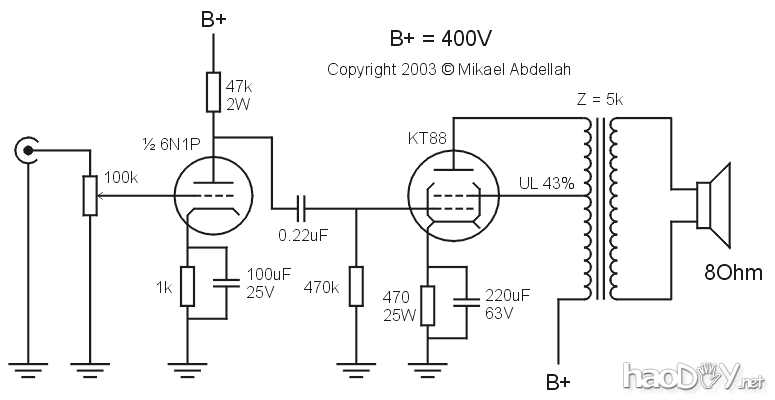 MIKAEL阿卜杜拉的单端(SE)KT88电子管放大器原理图流行的单端(SE)KT88电子管放大器原理图由Mikael阿卜杜拉。甲6DJ8 / ECC88管可用于代替的6N1P管具有良好的结果。 MIKAEL阿卜杜拉KT88单端电子管放大器原理图输出功率5W左右。这是一个75毫安板的最大功耗只有约68%的470欧姆的的阴极电阻设置偏置所以我们期待这个功放管寿命长。选择一个好品质的音频输出变压器,一个5K小学和额定至少10W。随着各种KT88放大器,取得了很好的结果,采用新的生产JJ KT88蓝色玻璃和Genalex -金狮奖KT88管。 DIY单端(SE)KT88电子管放大器下面的照片是Bernardo的DIY单端KT88电子管放大器MIKAEL阿卜杜拉的原理图。在照片的管恭维是Sovtek 6N1P驱动程序中的位置和输出位置中的一对匹配的电Harmonix的KT88EH。请参阅SE KT88电子管放大器由贝尔纳多线程他的身材的其他详细信息。