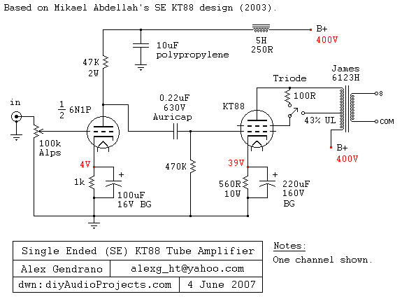 DIY单端KT88 / 6L6 / EL34 / 6CA7电子管放大器这里是一个单端(SE)KT88电子管放大器,我建立了一些笔记和照片。放大器的设计主要是基于MIKAEL阿卜杜拉的KT88 SE电子管放大器的设计从2003年左右。下面的图1所示的示意图本身KT88放,我已经建立。 图1:KT88电子管放大器原理图驱动级6N1P放大器部分Mikael的通常是相同的,与主要的变化是,输出管上的阴极电阻已增加从470欧姆到560欧姆。这降低了该管的板disipation和放大器也可用于与6L6和EL34 / 6CA7管。我加入了一个开关,使我切换ampifier的之间的的三极管短缺或超线性操作(原来的电路是超线性的)。此外,电源供应6N1P前置放大器部已加强了与另外的一个扼流。 电源供应器 - DIY单端电子管功放KT88 / 6L6 / EL34 / 6CA7是根据周围的5U4GB双管整流的电源,并在下面的图2中示出。我的朋友阿诺德·克鲁兹帮我修改由Mikael完成从原来的电源电路。管电源的详细信息,请参阅真空管放大器的电源设计。