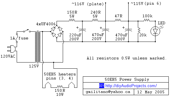 图3示出了我用的电源的示意图。显然有一些可以改进,但这种设计的电源已经打捞的部分,我手头上。用于筛选的上限打捞死的电脑显示器,不需要这个大(470UF总应该足够)。我用的变压器被打捞上来从弗利特伍德管控制台。我用PSU设计师II模拟电源,这让我非常接近最终的设计,我最终结算。我的目标是加热器和结束50V与52V。坚持应用笔记,我是射击板为110V和115V在屏幕上。我结束了110.5V板和115.5V在屏幕上。 最后的单端放大器的设计,我定居在图4所示。我用了一个10万的锅,因为这是我手头上 图4:50EH5单端电子管放大器原理图 建筑:50EH5电子管功放 至于我自己,我总能找到最耗时和困难的部分电子管功放项目的外壳。在努力把成本降下来,我构建了从旧一掌烹饪锅的外壳。的铝盘的一对夫妇图片所示的照片2和3所示。 ![]()
