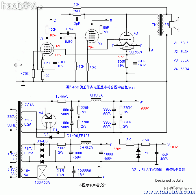 灯丝电压0-15V可调,两个317并联可达4A.B+现用变压器加调压0-450V,准备改用开关电源,电...