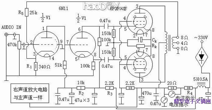 电源变压器定做,次级输出三组6.3V2A电压给灯丝供电,一组整流加降压电阻后(电压5.5~6V)供6N11的灯丝用电,另两组分别供给两对6P3P的灯丝用。第四组330V/0.4A的高压全波整流经CLC滤波后供功放级和前级使用,扼流电感使用的是手中现有的一只C形铁芯电感,该组高压未取太高就是为了调整Rk、R4后能使功放级工作于甲类放大。电路中加设了灯丝预热和先关高压电路,目的是为了延长电子管的使用寿命,图中省略未绘。 (责任编辑:admin) |