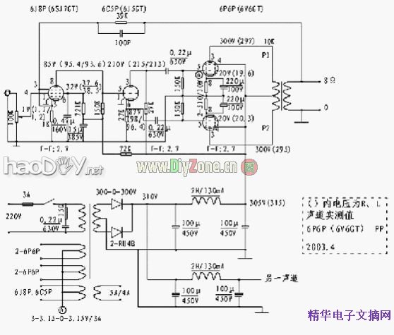 6V6的铭机不少,较著名的有美国Craftsmen的RC-2、C400,RCA的SP-20,SCOTT 99-A等…而我最后选中的的线路是赵娜丽老师在《视听技术》上推荐的一款6SJ7电压放大+6J5屏阴分割式倒相+6V6推挽(自给偏压)线路,使用国产管6J8P、6C5P、6P6P代用.原线路采用5Y3胆整流,但我考虑体积因素改成了晶体管.个别元件参数也调整了一下.