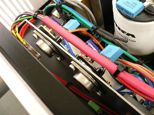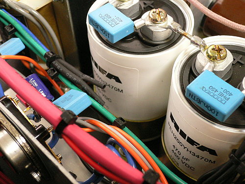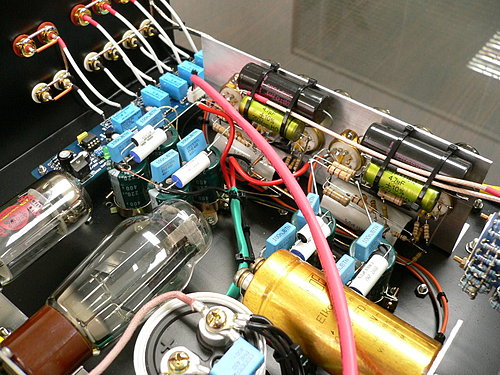 很多"大湿"只会东批评 西批评 12系列声音多差 多烂,说穿了自己没本事做好而已。 吹吹一池春水 那种低屏阻例如6DJ8 , 5842 都是薄声派的 , 再拿去搞单级放大,没韵味 , 没声音厚度,但却跟人家说这是透明 高音棒...如果真的比较好听 , 那只能说你的系统有问题#p#分页标题#e# , 整体结果不均衡,装机总是要多尝试、多挑战,你才会了解为何这些线路,例如M7C 能够让人风靡几十年 , 每个经典都有它的一套设计哲学存在 , 一个经典线路或者或是芳名流传的名机是都是团队再合力开发的 , 这过程不是自己抓个工作点,做个什么极简放大器能够想象的! 我自己装都用史普瑞的黑美人 , 请确认是唐竹卖的货 唐竹卖的才是正牌品 , 我曾用过大陆盗版的黑美人,靠,声音也不差耶!不过还是跟正版有段距离 ! 因为这次是把电压提高到 450V 所以用一般的电容绝对不够耐压 , 最高也只能找到450V的!! ![]() 所以我用两颗400V串联 取得800V的耐压 才是安全之策, 每颗电解电容一定要并上一个0.1u 这点小细节可以让整体提升不少 ,高音变的有光泽,不刮耳或者黯淡,如果0.1+0.001 这种配方会多很自然的听感 细节会缓缓的飘荡耳边, 那是种舒服的声染很难形容的感觉 ,这就是所谓的空气感吧。 实际上 0.1u电容 不一定要用RIFA,其实电料行的一般塑料电容就不错用了,我会用RIFA的原因是抽屉翻开都一堆小电容啦,不用白不用。 ![]() 壮观的 RIFA大罐头 , 眼尖的人会发现我用WE布线。 ![]()