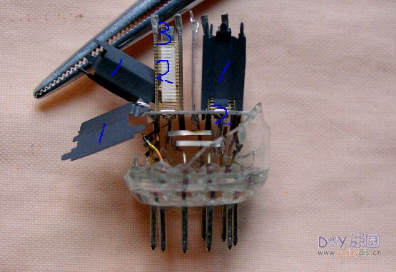 1:阳极;2:栅极,栅极里白色部分是栅极和阴极的绝缘层;3 就是阴极,这是个扁型金属管,灯丝就包在里面啦。