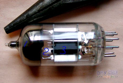 这是颗用于高频放大的通用双三极管6N1。1是吸气剂;2是灯丝阴极和栅极的组合体;3就是阳极。