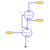 左下图2(a)电路。输出是从Vl的屏极取出,V2只单纯地做为V1的有源负载使用。由于使用了具有较高交流阻抗的有源负载,V1的失真率得到改善,但做为共阴极放大器,V1的输出阻抗依然是比较高的。在这个电路中,V1若不使用阴极的旁路电容,V1就会产生电流负反馈,使得V1的输出阻抗进一步增大,频率特性变差,并因为上下两只管子的工作状态对称,Vl的输入端变得灵敏。若使用阴极旁路电容,以上情况可得以缓解。为保证该电路有足够的低频下限,阴极旁路电容的容量一定要够,但也不可太大,以免造成不必要的相移。原则上要求此电容的容抗小于阴极电阻。电容容值可由下式求出: