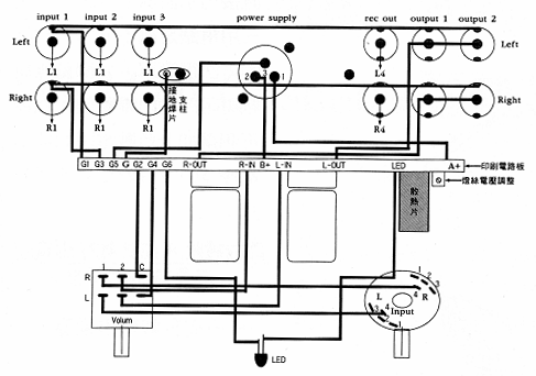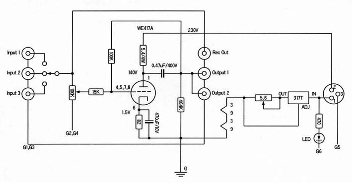 一、宽频带 传统的模拟音响频率响应大约在15KHz左右,到了CD唱盘数字音响时代,频率响应拓宽为20KHz,现今已推出第二代的DVD-Vedio,频率响应更拓宽为44KHz,又最近即将新推出的DVD-Audio,频率响应亦至少为44KHz,因此为因应DVD-Audio时代的来临,这台前级扩大机的频率响应至少要超过44KHz以上。 二、慎选真空管 要设计一台真空管扩大机,首当其冲的就是挑选一支适用的真空管,我们知道一台扩大机中对声音影响最大的二个零件一是输出变压器,二是真空管,而前级的电路很少用输出变压器的,因此一台真空管的前级最重要的部份就是真空管了。 真空管的频率响应要宽,其内阻必定要低,那一类的真空管具备这样的条件呢﹖让我们来分析一下(表一)中各型电压放大管的内阻。 由表中可以见到最常用ECC83/12AX7,屏内阻高达62,500Ω,虽然真空管的骨董级名器如McIntosh C-22、Marantz 7、QUAD 22之类的前级都用这支管子,但那个时代播放的都是些LP、Tape或调谐器等频率响应不宽的音源,而今的DVD频宽已高达44KHz,因此像ECC83/12AX7、ECC81/12AT7、ECC82/12AU7、6FQ7、6CG7、12BH7等小型管,或6SL7、6SN7之类的中型管都已不合用。 能合用的只剩下了ECC88/6DJ8、6463、5687、E188CC/7119/7004、E288CC/8223、5842/417A等真空管。 其中我最中意的还是这支超级电压放大管5842/417A!的管子,原因是5842/417A是一支单三极管,单三极管的内部只有一组三极管,不像其它双三极管会有相互干扰的情形。 三、只用一级放大 您知道一台扩大机中渲染最大的零件是什么吗﹖是真空管。也就是有增益的放大主动零件。我想玩音响的人都会有换零件的经验,尤其是自己装迷们,而每一位自己装迷们也都有换真空管、晶体、IC等主动零件的经验,更不用说是换电容器、电阻、导线、焊锡、插座等被动零件的经验了。您也一定知道换主动零件的影响要比被动零件大的多,这也难怪,我们换不同的被动零件只能用耳来判断,而仪器是测不出来的,但换主动零件就不同了,换不同的主动零件马上就可以用仪器测出不同,也可见主动零件的渲染要比被动零件大的多,所以我们在可能的范围内,最好尽量少用真空管,而且级数也愈少愈好,因为每一个放大级都需要一些被动零件来搭配才能工作。 四、尽量使用最少的零件 道理很简单,多一个零件就会多产生出一个零件声音,也就是多一个音染,因此除非不得已,我是不会多使用任何一个多余的零件的。 五、绝对不用并联 不但真空管不并联,而且其它所有零件也都不并联,电容器、电阻不说,甚至连配线也不采多条线并联。并联会造成什么样的声音影响呢﹖ 1.声音较为模糊。 2.低频较为膨账。 3.高频化不开。 4.中频聚焦不准,细节少,有雾。 5.发声顺序不一致。 但是如果电阻的瓦特数不够,不并联又怎么办呢﹖很简单,用串联的。 六、电源与主机分离 前级扩大机除了音质要好之外,还要杂音低,要杂音低,就必需将电源与主机分离,并且最好还要稳压,以获得干净的电源。 七、真空管整流与稳压 真空管整流与稳压的音质当然要比用二极体或晶体好太多,虽然体积会大很多,但是为了声音的不妥协,当然还是用真空管来整流与稳压了。 单端,又只有一级放大器的设计是非常简单的,请参照5842WA/417A特性规格,由图可以见到417A最佳工作点曲线是1.5V,在-1.5V的曲线上我们再挑选最中心点,也就是Eb=130V,I8mA的地方。 阴极电阻与旁路电容器的设计 有了偏压为1.5V,电流为0.018mA这两项数据,我们就可以先设定阴极电阻Rk的值: R=E/I =1.5/0.018 =83.33Ω 我们可用82Ω来代。 除了阴级电阻之外,我们还要一支阴级旁路电容Rc,因为加上旁路电容的输出阻抗会比较低些,阴极旁路电容的容量与Cut Off的低频截止点(-3db)有关,其计算式为:C=159/fR 其中C的单位为uF,f为Hz,R为KΩ。 例设我们设定低频 -3db的截止点为5Hz,代入公式: C=159/5×0.082 =387.8uF 我们可用330uF~470uF/10V的电容取代。 屏级负荷电阻的设定 设计了阴极电阻及旁路电容器之后,接下来就要决定屏极电阻值了,我们知道屏极负荷电阻范围为rp的3~7倍,一台前级的输出阻抗要尽量低,因此我们选取较低的3倍数值即:1.8KΩ×3=5.4KΩ 知道了屏极电阻Rp值后,就可以计算所需的B+电压值了,我们已知屏极电阻值为5.4K,电流围0.018mA,因此跨在Rp上的电压值为:E=Rp×I=5400×0.018=97.2V 我们已知屏极电压值为130V,加上屏极电阻上的跨压为97.2V,因此B+供应电压值为B+=130+97.2V=227.2V 负荷电阻的功率值 让我们来计算一下屏极负荷电阻RL所需要的功率值: P=Ed×I =97.2×0.018 =1.75W 屏极电阻5.4KΩ用2W的电阻是不够的,而且也找不到这个阻值的电阻,因此我们可用二支2.7KΩ/2W的电阻串起来用,合起来是5.4KΩ。 输出交连电容的设定 交连电容值的设定是一台放大器里很重要的一环,数值的大小与音质有关,是不能乱用的,设定时先要决定低频截止频率(-3db点),然后再依下一级的输入电阻值代入公式就可以了,其公式为:C=159/fR 其中:f为我们希望的低频截止点,负荷电阻R亦即下一级的输入电阻。 这里的负荷电阻并不是单纯的本级负荷电阻值,因为前级扩大机的输出是要交连到后级扩大机去的,会与后级扩大机的输入阻抗并联作用,因此这里的负荷电阻值就不能设定的太低,如果太低的话,并联之后的阻值就会太低,例如本级的负荷电阻设定为100KΩ的话,与下一级的100KΩ并联之后就等于50KΩ,因此在这里我们可用470KΩ~IMΩ的较高电阻值,这样并联后的阻值几乎