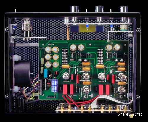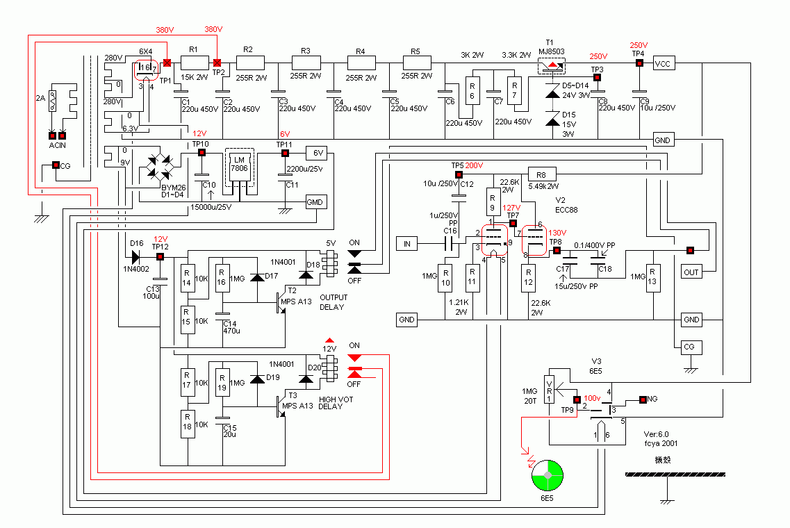 附上电路图 不过此机身价高于6位数不是我这市井小民所负担得起,但是过不久一位多金好友购买下此一部机器,要在下去试听[我想应该是要…]于是驱车前往到达他家试听,由于前些时候在音响店未能仔细观赏此机器,故称现在有机会特地仔细欣赏一番,连机箱上盖都打开仔细端详(虽然上盖是透明玻璃片),乍看此部机器线路尚称简洁电源电容部份几乎全部使用「ROE」立式金色电容,金色亮晶晶煞是好看,交连电容则使用WIMA电容,而真空管则采用德律风根E88CC金脚两支[此系列机器有含PHONO机种或不含PHONO机种本次仿制的线路为无PHONO机种],于是怂恿朋友把此机线路简洁仿照一台应该没问题,不料朋友竟然回达一句如果「你有办法仿制我就让你拆机器」,于是嘿嘿嘿….. 制作开始 由于没有原机线路图于是把朋友那部机器拿来把拆开对照电路版把线路依样画葫把「样图」画下来并把零件数值一起抄录下来,好了于是按照所抄下来的零件数值与样式到材料行购买零件,完了除了WIMA电容以外其余的电容都有问题[WIMA佑X是专卖店]ROE立式滤波电容就没有问题佑X没有进口,别家也找不到原机使用的立式然而佑X只有卧式,不过没关系穷则变变则通大不了重新再规划PCB,猫眼则暂时找不到于是暂且搁下,而且此猫眼管只是当做电源指示而已跟主放大部份一点关系也没有。 材料弄齐全了于是回家自己再把PCB重新规划一遍,把PCB依照在一般材料行所弄来的零件大小再规画上一张PCB图,由于猫眼部份只当做电源指示灯有无没关系就此先放弃等找到再说,只把主线路先仿制起来,哇塞此块PCB超大整块面积有30公分X23公分之大,而且一般商家根本没有这么大片的PCB,由于面积大厚度不能太薄否则就变成橇橇板了,只好到金电子定制PCB,从开始会洗PCB至今,从来没搞过这么大片的PCB,一般材料行所卖的溶解盒根本没那么大,没办法只好到卖观赏鱼的水族馆店定制一个专用的鱼缸来洗电路版(好笑),PCB洗好了就把弄来零件一 一插上PCB连真空管子脚座也一起焊上,用目视仔细检查一遍无误,(在此奉劝初学者要养成一个好习惯就是要把零件要插入PCB之前先用电表量一下看看零件是否不良),在先不要插上真空管的情况下,插上电缘用电表量一下各个工作点的电压看是否一切正常,OK关掉电源再把管子插上再开启电缘看见灯丝如预期的慢慢起来,没冒烟成功了一半,于是把函数讯号产生器接上输入点把输出调在1K 100MV处,输出端接上示波器观看工作情形,当从示波器看到波形正确展示就把整个心放下来了辛苦没有白废,机器搞好了最重要当然是实际试听不然只有纸上谈兵没什么用处,接上后级但后级先不开电源先把此部前级RUN一下也顺便际际五藏庙,机器经过约一小时的热机再用电表量量各工作点看看是否正常有没有问题,一切正常打开后级与CD PLAY(死猪 不累)放一张自己熟悉的 死猪 唱片,当从喇叭传出完美的声音一切辛苦没有白废(还好不然就白搞了),一连试听好几种音乐真的好听 从热门到古典或是日本的演歌,不管中高音真是甜美尤其是中音真是饱满,至于低音部份一点也蒙糊解析度相当好,我后级是采用MOSFET当做输出级[也就是敝人所仿制的包君满意的MOSFET_100W后级]。 隔日携带此机至朋友家与原厂机比较,为了比较缺换特别接上切换器用AB方式比较试听,我也觉得此法比较客观不然这部换那部总有时间差快速切换器材试听比较客观,长时间的比较差别不大,真的要说出差异的话,原厂机高音比较细腻,低音比较厚一点尾韵比较短,中音则差不多,(以我的木耳朵来讲)心想真空管子应该一定有关系于是把管子对换再是听果然不出我所料,声音又变样了于是把两部都差上同样的管子,先热机30分钟再比较试听,嘿这次就听不太出来了, 因为原厂机使用德律风根E88CC金脚而我只用一般德律风根铁脚,音色理论上当然有所差别,因为只有滤波电容立式与卧式不同与电阻材质不同而已,其它像交连电容一样是WIMA理论上音色应该不会差距那么大才对,连续听了一上午一点也不觉得累,心里正高兴者忽然看见朋友脸色表情不太好,居然DIY能搞出这种成绩(此君对DIY没多大信心)经过此次事件之后大大对DIY另眼相看,也改变他对DIY的看法。 重新改良再制作 由于上次对此部机器的比较试听,给我很大信心也燃起对管机前级的热爱,于是再把此部D.KLIMO MERLIN LS前级重新改良设计一下,把高压用的固态二极体高压整流换成真空管整流由于此部机器电流消耗不大,所以以一支6x4整流管的电流来应付措措有余,(下图为真空管整流电路) 再把高压滤波电容换成金属薄膜电容对于音质一定有改善,放眼一看容量有超过100UF/400V的金属薄膜电容实在不多,最后挑上Solen电容,此类型的电容用在主电源部份会有良好的声音,并且有很多机器也使用它,而且用此电容中音也会变得比较饱满纯厚,本机高压电源供应部份比较特别采用类似一种「拍型滤波」此滤波方式可以有效滤除电源交流声及杂讯,由于此机采用4「极」滤波所以除了第一棵电容以外其余的电容量不须要很大,约在47uf 400V左右即可电阻则用2W以上以免发热产生杂音,容量在225欧姆即可。 稳压部份则只用一棵晶体来稳压,再用稳压二极体来稳定电压,由于电压高达250V如果只用一粒稳压二极体来稳压必定会产生大量杂音况且如果只用一棵必定要使用10W以上规格不可,这么大的稳压二极体不只难买而