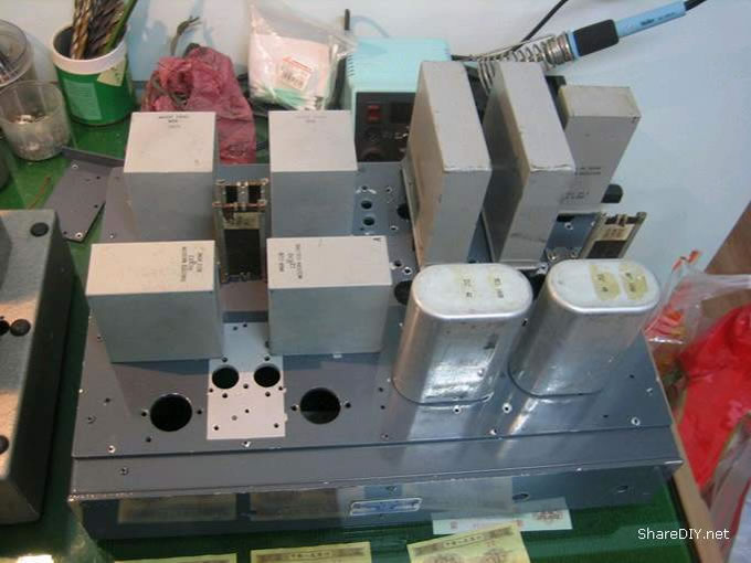 主放大部分,盘面由于属实验阶段甚为难看,但丝毫不影响声音的表现,栅极用上两个600H牛取代AB栅漏电阻,此举带来更加丰富的泛音和余韵,阴极电阻则用上最高级别的铜箍边40年代WE骨牌线绕电阻,声音之美妙乃属意料之中。