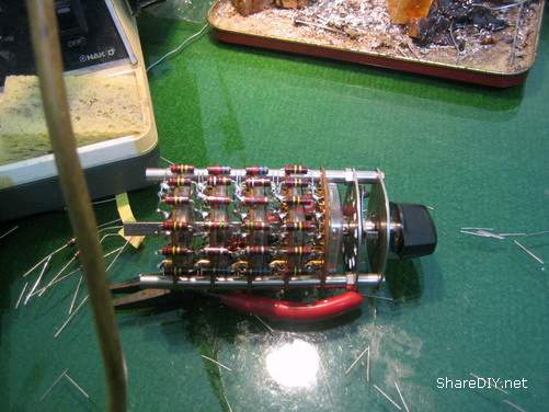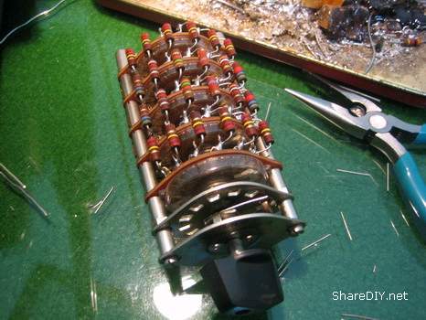 重新用镀金架和AB电阻(自己只喜欢碳阻)制作了分流电位器,毕竟是第一关,不敢有丝毫怠慢。 AB电阻会不会精度不够,噪音大点.我有个DALL金膜做的,总觉得精致带冷感,没有碳膜制那么温暖蜜月里新做的全西电零件437分体电源前级