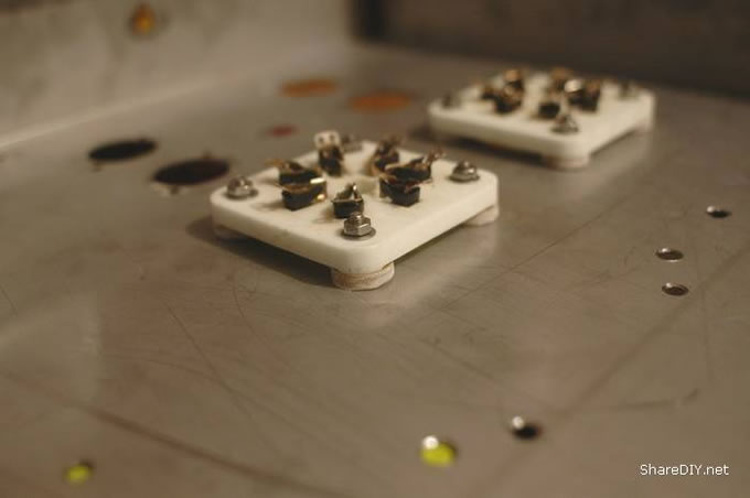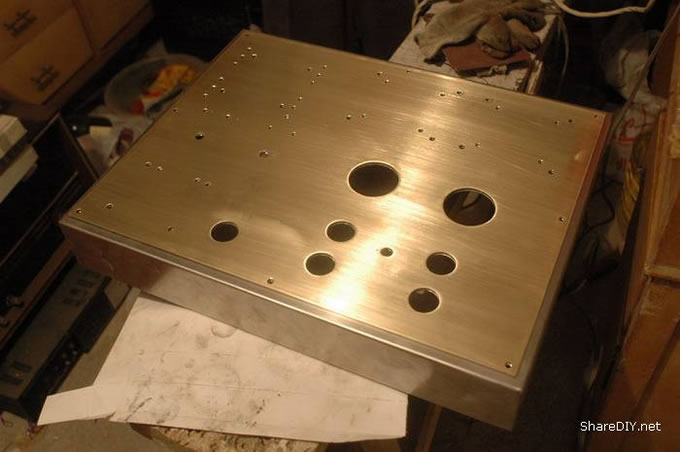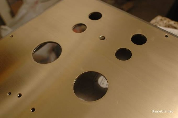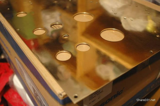 第一种布局的方案是这样的(对称式排列),在不锈钢底盘上面覆盖一块基本与底盘面积等大的2.5MM厚黄铜板,留出不到一厘米的不锈钢边