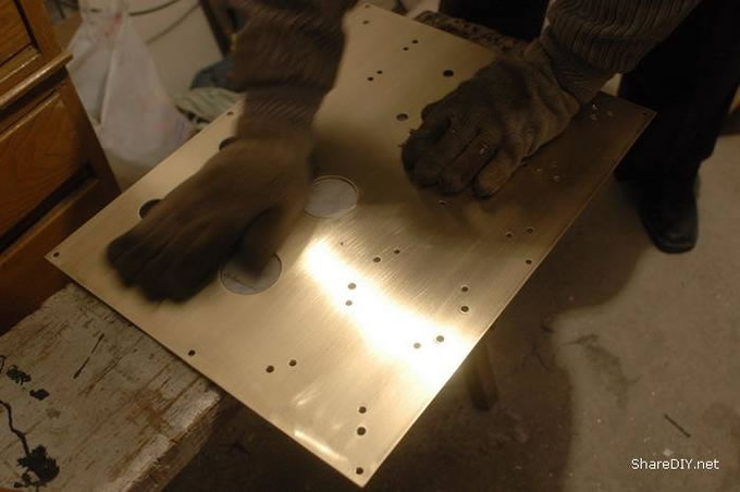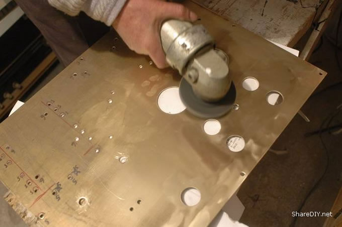 手工砂纸打磨之后用手提砂轮加纤维轮进行抛光,抛光过程中砂轮与黄铜板磨擦产生了大量的细铜沫飞尘,对工作间造成了严重的空气污染!!!我和家父吸入铜沫后极其难受,当时没有戴口罩,强烈建议胆友们加工黄铜时一定要注意保护!!!!!!!!!!切记~~~~~~~~