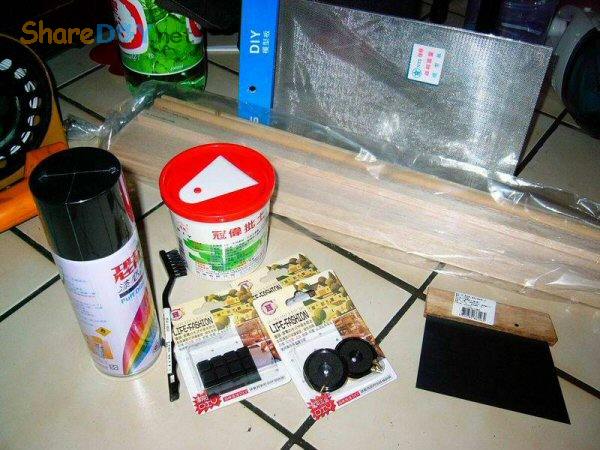 图裡有补土,机箱脚垫、橡皮垫、金属网、喷漆、补杯(好怪的名子)、刷子以及一堆巴尔莎木版与木条,算一算又花了800,自己做机箱真的没比较省阿>_<