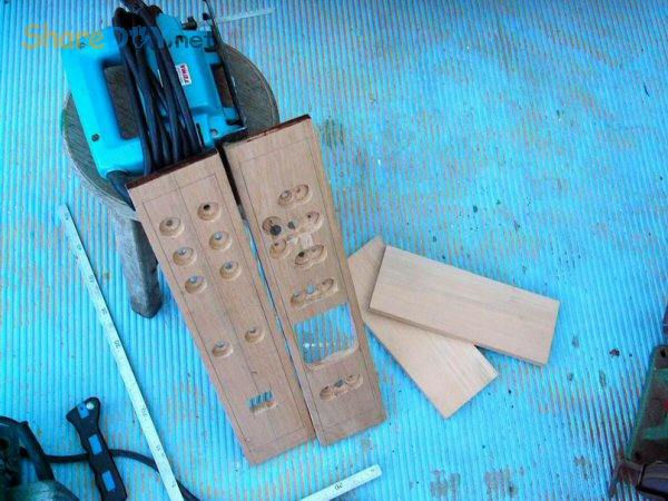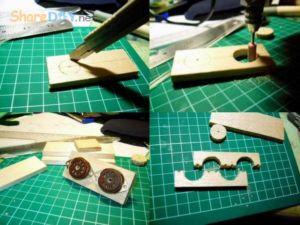 图说:巴尔莎木做EM800的VU显示窗,右下角可以看到因木质太鬆软,鑽孔后破成两半了(又得重切了)。