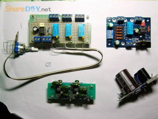机箱仅完成1/3,有一堆洞还没补:-p...还没上色,预计是黑色的,想彷钢琴烤漆。透明漆也已经购买了,上盖\的8mm强化玻璃也已去订做,剩下机箱下板比较头痛,还在想要怎麽弄。周边辅助电路大致上都完成了,包括EM800驱动与电源、DZ延时输出保护模组、讯号选择模