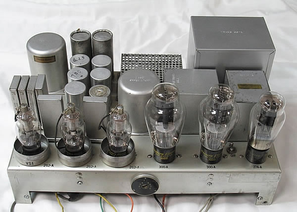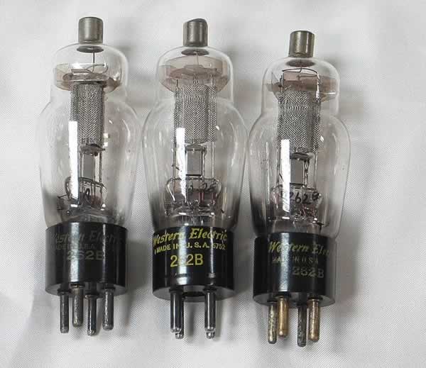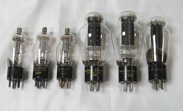 线路图(3),在设计86A时是使用一对300A作推挽功率管,当时300A生产的数量是比300B更稀有得多,又因特性相同,可用300B直接代用300A,由1930年代的300A全是凋刻字的胶底座,直至40年末,同时出现凋刻字的300A和300B;自此交接期开始,可算是由成熟期的300B取代萌芽时期的300A。前面有三支262A旁热三极管图(4),VT1和VT2是两级的输入讯号放大,VT3则是直接推动交连牛的推动管。262A和262B、300A和300B、310A和310B是相当近似的情况互换,图(5)整套单声道86A所用的胆。但整流胆274A就不能直接插上274B代换了,虽是274A和274B特性相同,但它们的脚座类型是不同,所以不能互换。