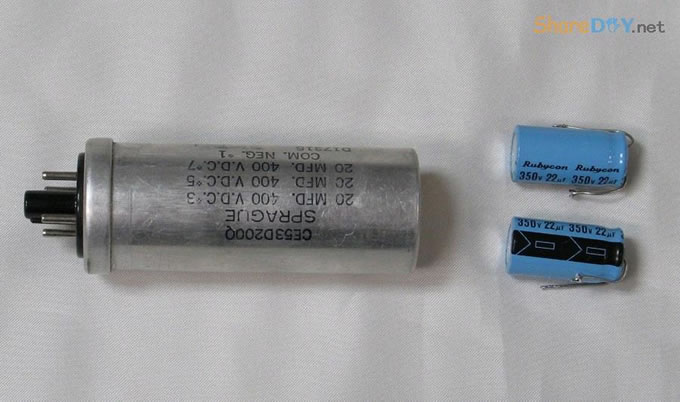 另外,交流 “hum”聲處理方面,《西電》也是一成功例証,當年代的設計師們靈活的運用扼流圈choke和電容的數值配合,足以應付合理可接受的低hum聲和兼顧靚聲共存的設計。圖(4)這《西電》No.105A和No.106A正有相當卓越的表現,無論音色、速度、動態、頻寬……都凌駕於現今很多大名牌之上,而且古老《西電》的名機在有識之士眼中所佔的心目中超然的地位;更不是一般凡夫所能領略的!圖(4a) 左邊是原裝古董插座式電容,右邊是修理工人裝上的新裝電容。