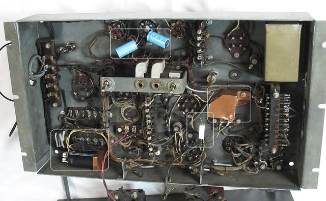 這對No.105A前級來問診時已知兩聲道音量不平衡,並同時告知購自東洋,經日本大師抽掉了輸入牛,可減低了放大倍率……此話云云。機主除了關注兩聲道平衡問題之外,還要求使它全面恢復原狀,連接回輸入牛和零件的配對也是此手術重點。開棺驗屍,即時令人慨嘆之事不得不提,圖(7)做了記號 “圈”著的部份,若對古董或西電機不太熟識者,可能不易看出破綻!但一經細察,輸入牛廢了是可見的。 又發現音量控制volume直通連接輸出管336A的柵極輸入端,噢!這No.105A是高於No.106A一倍的身價;那麼就祇是用了No.105A的三份之一?廢了輸入牛285L、262B輸入管和310A放大推動級,即是失去此機的三份之二的功能,等同損失了按這比例計算的價值,哀哉!