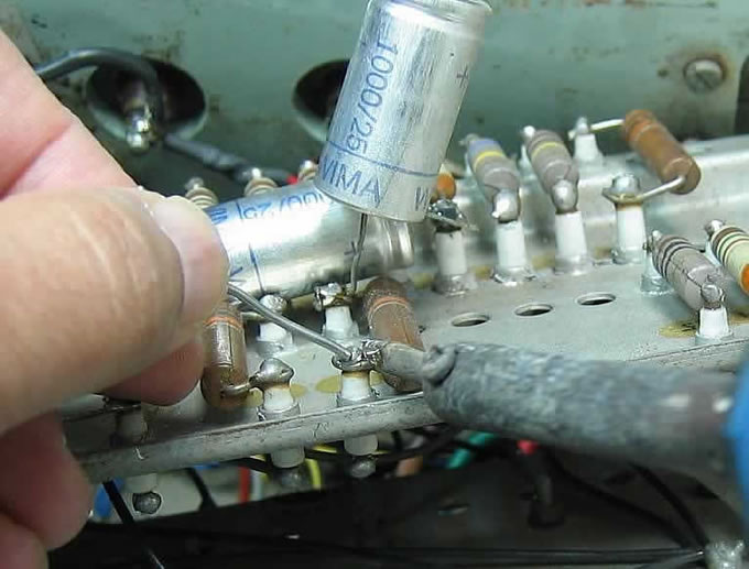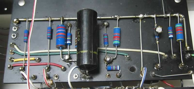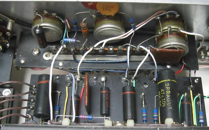 請看圖(7)和圖(7b)來機前的狀態,圖(8)是依原裝數值的電容電阻給它還原的狀態。幸好筆者手頭仍有少量健康良好的Sprague Bumble Bee電容,用在這「名器」機上也是甘願的,又因來機時電阻和電容的數值是被更改了,於是要參照線路圖的數值來作這還原工程,若選擇更換Sprague斑間的電容時,必須測試電容的阻隔直流性能(漏電),不過按線路的特性,馬蘭士 “1”對電容漏電狀態要求相對M-7直接交連的0.01u就不算太高,因為每一級都不是直接交連的。
