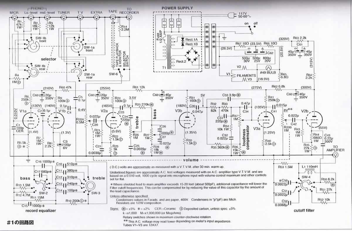 說來奇怪的是1953年面世的的馬蘭士 “1” 竟會看重Line Amp多於phono?這年代的主要音源是唱盤! 當然不會忽略phono stage!若細看線路圖就可見M-1是很有代表性的設計,而整部前級的結構和聲音的調校是整體而一氣苛成,也是聲音互補協調的。唱盤放大部份的兩級放大是用負回輸CR.電容電阻衰減式,有趣而好玩的是可隨「用者」喜好調校的LP衰減電路,即近似RIAA均衡網路,因五零年代當時RIAA還未完全統一,也有些45轉或78轉的黑膠唱盤片錄音時是未依據這錄音與重播的均衡增益和衰減曲線,所以M-1這部份做成自由選擇的phono級高音和低音調校,是多麼的靈活和適應個人口味。若單以phono級來看M-1的動態和控制力是不及M-7的(因M-7是三級放大的),不過M-1的Line Amp部份有足夠的能量和動態彌補了本機phono之輕微不足之處,因有四級放大和沒有負回輸的結構,增益高是為了CR衰減的高低音調控制和連續可調的響度補償的電平衰減所需,還有是輸出的緩衝級之前是有電平控制的(相連同步於第一級的輸入端音量控制)。
