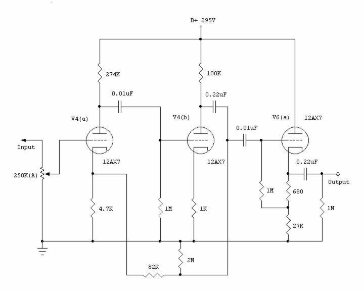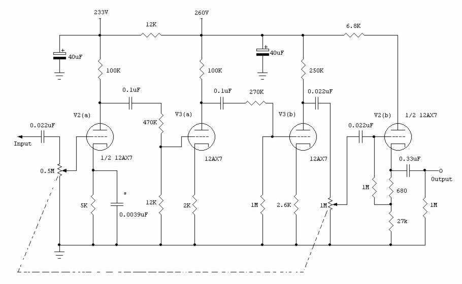 筆者不妨建議愛發揮自己改機或設計才華之士,何不為自己重新設計或製造屬於「自己」的前級呢?現奉上簡化的M-1(圖5)和M-7(圖6)線路圖,可作比較或試製。在圖(5)的第一級12AX7並聯著5K的陰極電阻的旁路電容0.0039u或可除去不用,是為了補償Loudness Compensator所衰減的高中音。