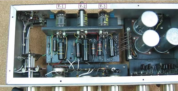 圖(8)頂視圖,按位置由左至右V-1是唱盤放大級,中間的V-2是Line-amp的輸入和緩衝級,V-3是響度補償Loudness-Compensator和音調控制Tone-Control,若一嘗玩膽樂趣則須知左右聲道共有六支12AX7,並不必要六支都用同一牌子種類的膽,而是可以兩聲道按不同放大位置配對的選擇,即兩聲道的V-1是一對、V-2是一對、V-3也是一對,若不用唱盤而只用CD者,則V-1就無須用靚膽了。 (责任编辑:admin)