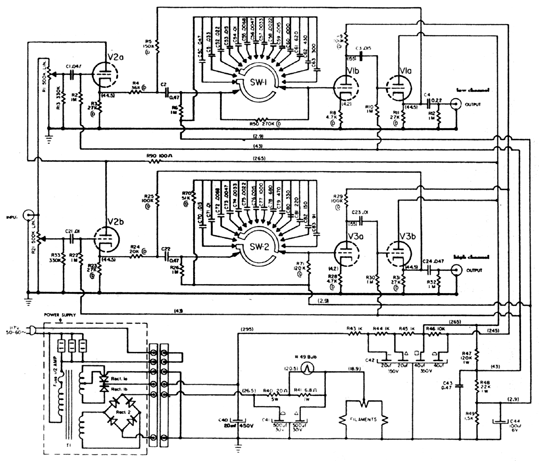 分體左右聲道和各有獨立電源,純銅旋扭和金色的焗漆面版;分體電源也是金色的,極盡豪華瑰麗的外觀。此機是兩路的膽電子分音器,高音、低音段各12段分頻選擇由100Hz至7000Hz各12db音程衰減(Roll-off),還有獨立高、低兩路正負10db的音量控制器,每聲道各用三支ECC83/12AX7作線路放大,請看圖( 2 ) ,我們留意線路圖中的三支12AX7都是加有正偏壓,是為了提供不會太高增益和可令聲音保持一定量的控制力(不會慢聲)。V2a、V2b是高低音兩路的輸入增益控制,V1b和V3a主要增益放大,而V1a和V3b是輸出緩衝級,也是馬蘭士的素常習慣,是用陰極輸的 ( 陰極輸出法比屏極輸出較為低失真 )。因有正偏壓DC-2.9V和DC-43V加於12AX7的柵極,所以全機的最高增益放大只有10db,所以就跟一般的20db前級放大有別;還有的是用電容和電阻作C.R.諧振選頻。電源供應部份仍是整流「硒」,M-3高壓整流比M-7優勝的地方是「全波整流」,即電源牛有兩組高壓用兩組「硒」取得交流正弦波的「正相」,優點是效率高和少開關失真。