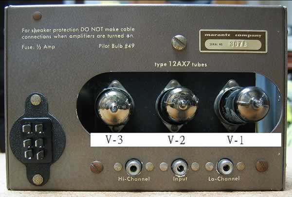 圖(11) M-3的背部,每聲道用三支12AX7,兩聲道共用六支12AX7,但並不要求六支12AX7全是同牌子或配對,筆者建議此機可分級配對膽,即可用三對不同牌子和不同年代的12AX7;即V2是一對分左右聲道使用,V3是一配對,V1亦是要左右聲道的另一配對,這也是玩膽機樂趣和藝術,各類不同牌子的12AX7音色差別;可玩足三款,請參考本刊的創刊號(五月)中的《12AX7大比併》。