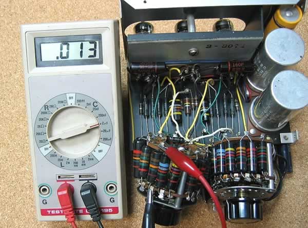 筆者已於本刊六月號《玩盡馬蘭士7》的文中提供關於量度交連電容的漏電測試方法,一般是可在原機線路在工作時量度電容;但M-3就有不同了,原因是每級12AX7的柵極都帶正偏壓;所以最好將電容拆下,用另外方法測試,看圖( 4 ) 是簡單的外置電容測試電路,務求找出電容測試點是零電壓,即它是可以良好阻隔直流。另方面,當然順便用電容錶量度這拆下的電容數值,不過交連電容的數值要求並不嚴苛,即V1b交連V1a和V3a交連V3b,還有V2a和V2b的輸入電容數值不須太執著,祗要不漏電和正負10%誤差也可接受;但是斑間電容用在此位置往往都不能信賴,建議改用Sprague的橙色字black beauty信任程度會更高。不過分頻電容就不容忽視,負責低頻的數值是: 0.047u、0.033、0.022、0.015、0.01、0.0068、0.0047、0.0033、0.0022、0.0015、0.001、620p、430p、300p;負責高頻的是:0.015u、0.01、0.0068、0.0047、0.0033、0.0022、0.0015、0.001、680p、470p、330p、220p、150p、91p等。我們要留意的是斑間的Bumble Bee是最大的差誤的源頭,而啡色的mica雲母電容是很穩定,無須費心。又因Bumble Bee的誤差太大(甚至50%),因此祇可選擇性的電容配對,通常最常用的分頻點是350、500、700、1000和1500等,我們就在這幾級下功夫好。在此一提,就是這些分頻電容是無須拆出來就可用電容錶量度,圖( 5 )不過這C.R.電路是兩粒串聯分流式的使用,所以當量度電容時,最好將選擇制詷至別的檔位;以免影響量度的準確,當量度時可令你驚訝的是有些電容可能有正負50%的差距。