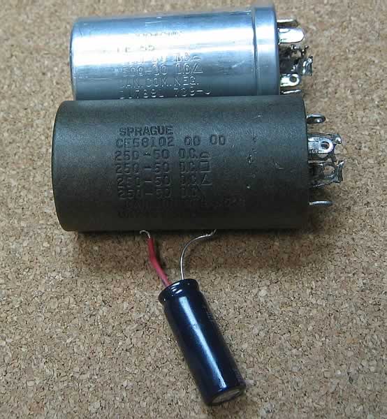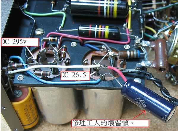 另外又發現在燈絲濾波電容上並聯了非原裝的日本電容,原因是原本的Sprague 500u + 500u電容失效圖(9a),修理工匠為了省時省力才作出之行為,看圖(9)。筆者仍是把持著個人宗旨,就是盡量給機會和玩盡每一部機,以原裝料替換當然是重要的,幸好在我電容倉庫找到兩支Sprague四組250u 50v,亦即可以將四組並聯作兩組,等於500u + 500u ,就是那麼幸運跟原裝數值相同,而且這兩支是黑色紙套Sprague,比起原裝的還要好聲,看圖(10) 是古董派發燒友夢魅以求的極品。我肯割愛而成全M-3,YK.當然是求之不得。