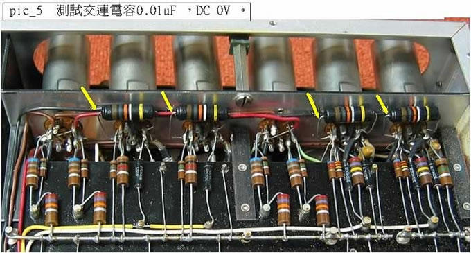 ( 二 ) 測試交連電容:在 12AX7 的第一級與第二級放大的交連電容通是用 Sprague 班間電容 (bumble Bee) ,這電容的漏電率相當高 ( 交連電容的作用是只許聲頻通過而直流電受阻隔 ) ,但若因電容漏電的緣故所以影響第二級放大的工作點和膽的壽命,( 圖五 ) 所示的四點箭指位置應是 0V DC 的。
