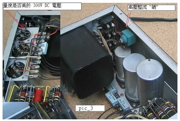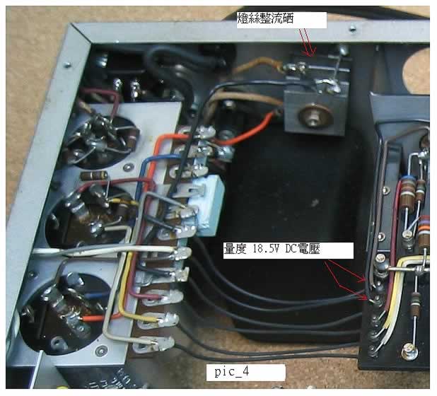 ( 一 ) 整流器: M-7 的高壓和燈絲是用古老的半導體俗稱“ 整流硒 ”(它不是矽),硒的效率和整流性能比矽為低;但又因“ 硒 ”特別討好發燒友的歡心 ( 好聲 ) ,於是為了原裝的硒到處搜尋而不惜一擲千金者眾,若要自行動手測試這整流“ 硒 ”也是可行的,只要閣下有 DC 電壓錶就可量度整流硒輸出至第一級的濾波電容的電壓值,通常是介乎 300V 至 320V( 以不低於 300V 者是正常 ) ,不幸者若電壓點低於280V 以下,就需要找替換了。 ( 圖三 ) 另外還要量度燈絲整流是否接近 18.5V DC ( 圖四 ) 。