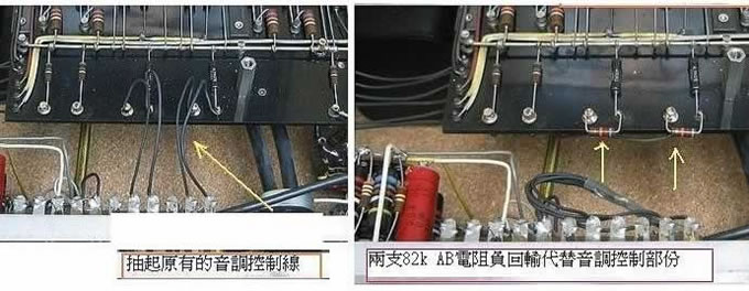 ( 四 B) 我們使用 M-7 時很慣常地將高低音控調至中央 ( 正是 Normal 狀態 ) ,既然是甚少或不會使用音調控制器,何不將它的 Tone control 抽離,可以將這部“ 前七 ”玩得更盡,因為簡化了很多接點和引線並減少電容和電阻的相位失真,因此大大提升這“ 前七 ”的通透度和控制能力;聲音的從容度亦提升了至少兩班;就如揭開了一面濛濃的面紗,多麼的過癮啊!不過亦有人喜歡原有的音染和暗昧,就悉隨專便了。這手術是將從零件排板引到音控的四條幼電線銲起,接上82k AB 電阻參閱圖 ( 圖七 ) ,再進一步亦可將 V-6 最後輸出的交連電容直接引到 RCA 輸出插坐,這樣又更直接,亦免除很多不必要的接點和 Hi /Low Filter ,這“ 七仔 ”就更上一層樓了。但切記抽起音控的四條幼電線和加上82k AB 電阻後,是必要加兩條引線將 V.4 、V.5 的輸出電容 0.22uf 接通 V.6 輸入級電容 0.01uf ( black Beauty 新改 ) 才是最後的完工。