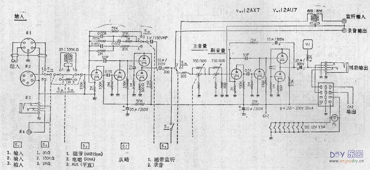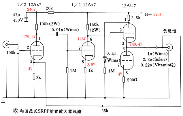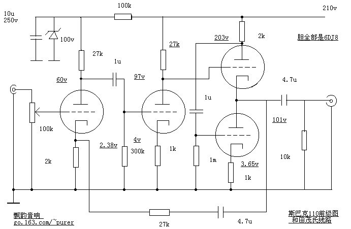 电源变压器50W X 2 电流75MA X 2 原理图 ![]() 电压参数: ![]() 原版线路 ![]() 6N2+6n11和田茂氏线路图 ![]() 斯巴克110仿和田茂氏前级线路图 ![]() |