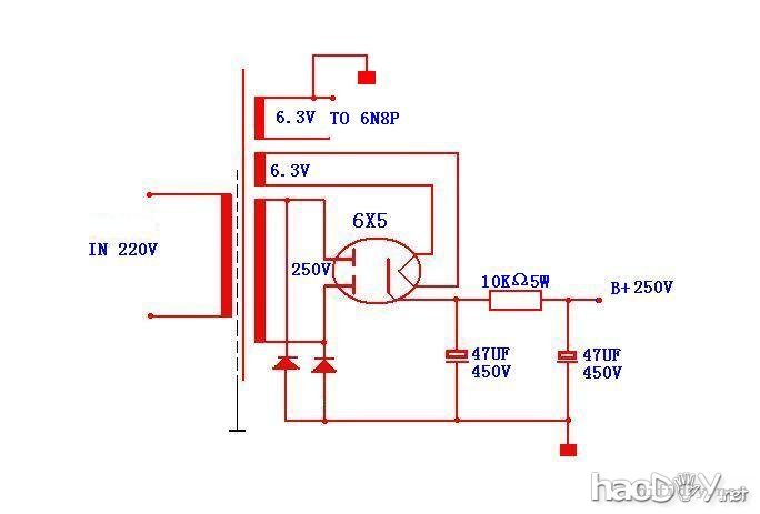 6X5的灯丝电流和电压:6.3V/0.6A,直代国产的代换管为6Z5。 ![]()